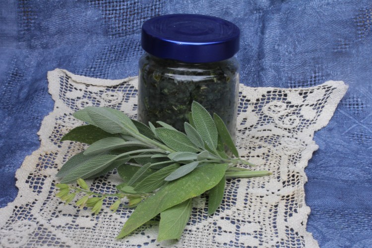 I make this a lot because it is so versatile and will last in the refrigerator for months. It is a good substitute for all those dried particles in you cabinet that pass as spices. It contributes a lot of flavor, freshness, and “green” to those fall meals. It can dress up any protein, vegetable or grain. You can blend it into a soft cheese or sauce. I have used it to make salad dressings, marinades, etc. The possibilities are endless. I see it as a way to store sage over the cold times of the year until fresh is available again.