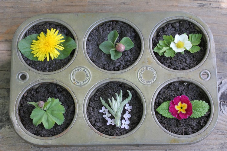 Mud Kitchens can bake cupcakes make from mud and fresh herbs. I used dandelion, violet, oregano, chive blossom, strawberry flowers, feverfew, sage flower, lady’s mantle, yarrow, lilac, primrose, lemon balm. Have a chef instead of a baker? Make a setup for street tacos using large leaves, “fillings” gathered from the yard, a spice bottle/salt shaker with dried herbs, a small squeeze bottle filled with a pesto like sauce. Sushi and nori rolls can also be a possibility. It is never too early to model the idea that healing can come in the form of food.