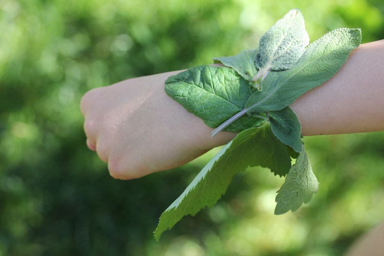 Herb Bracelet or crown-starts with a piece of tape secured around the wrist or forehead with the sticky side facing out. The child is encouraged to explore a natural area like a garden or walking trail. As he/she finds and identifies a medicinal herb, a leaf is attached to their bracelet or crown as a record and decoration.