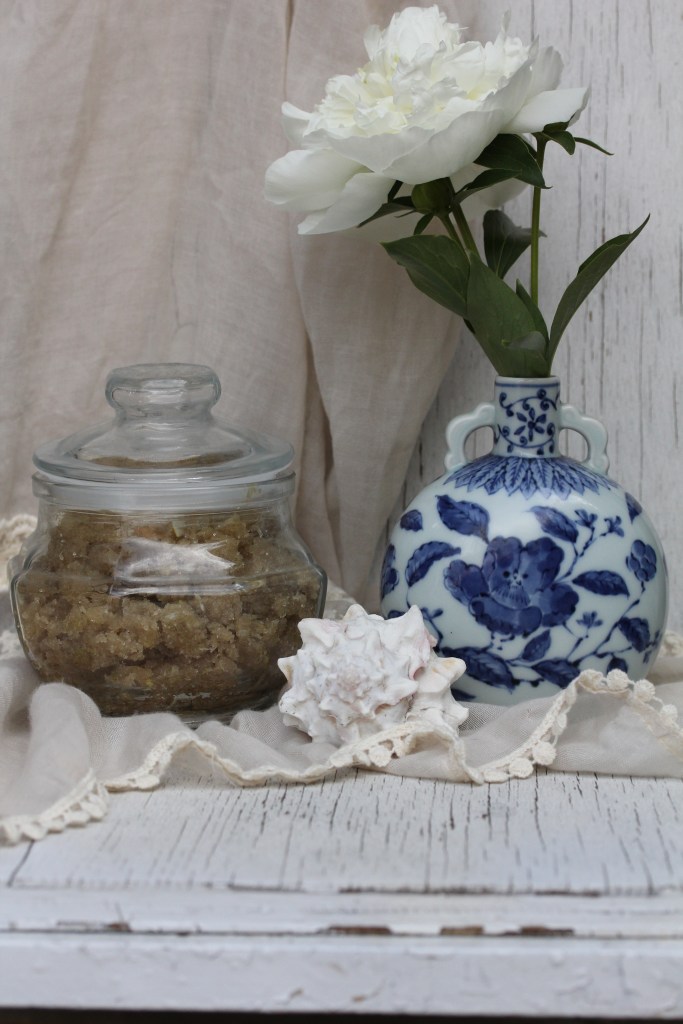 Peonies are my favorite flower. They bloom without fail the first week of June. They were in my wedding bouquet and serve to remind me of that anniversary every year. The scent is amazing and hard to describe or “create”, just like plumeria. This sugar scrub actually holds the scent quite well. I can’t wait to use it in the shower tonight.