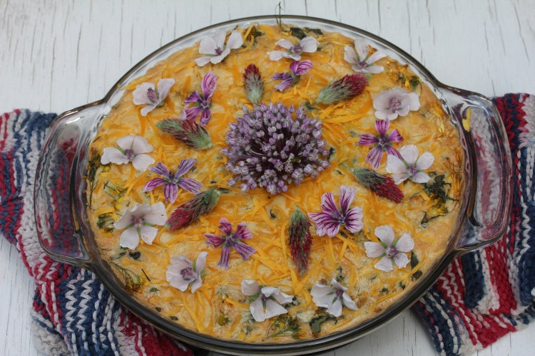 Once cooled, as a garnish arrange larger/whole edible flowers arranged in a mandala or “picture” (nasturtiums, malva, red clover, marshmallow, leek, pansies, etc.) for decoration. Eat immediately . Serves four people.