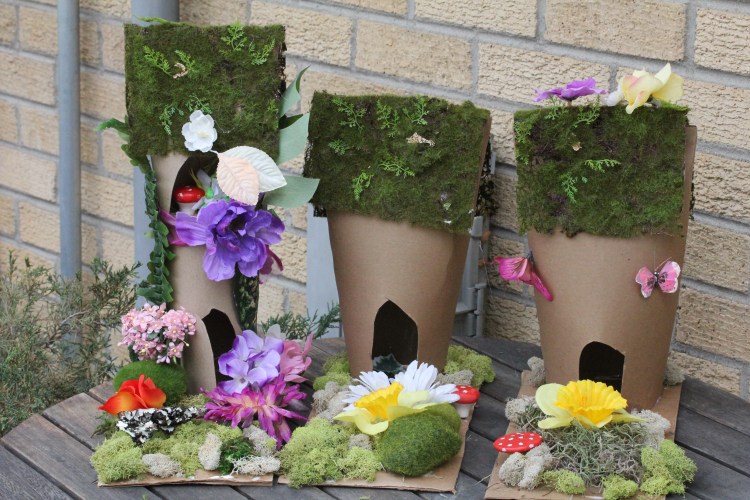 Herb fairy houses-cardboard tubes decorated with store bought artificial flowers, moss rocks, and moss panels. Goes well with the Herb Fairies book series written by Kimberly Gallagher.