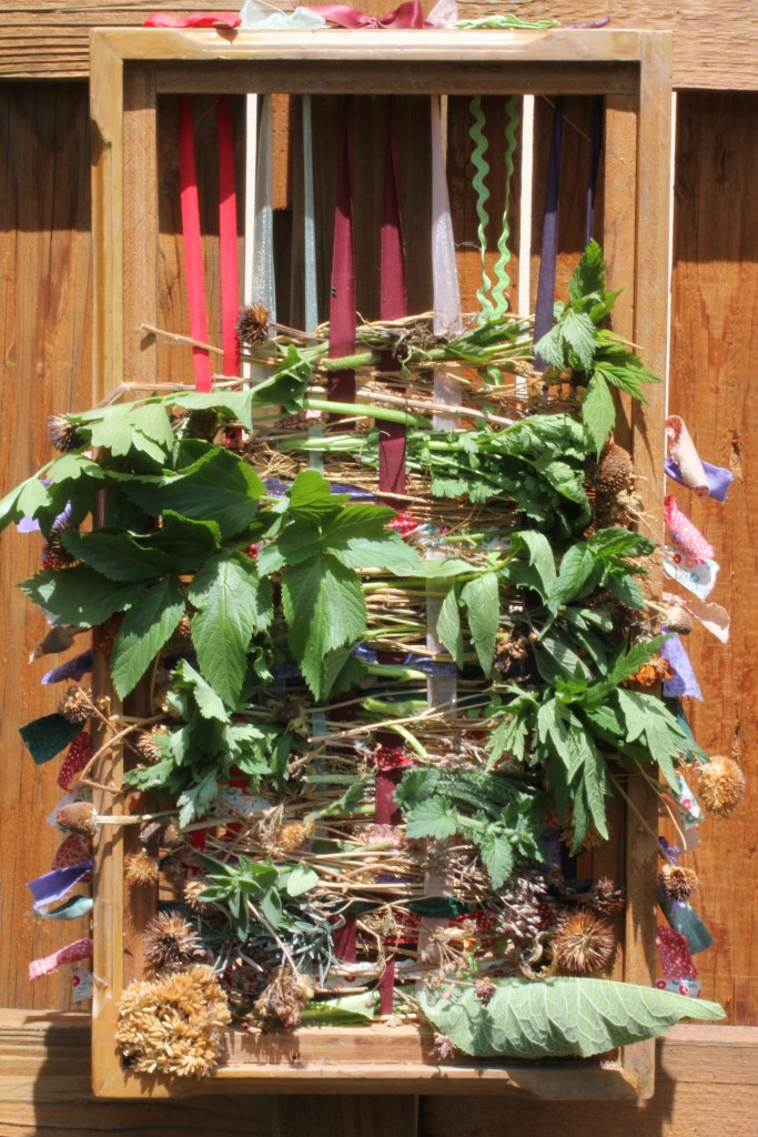 Herb loom-weave fresh plants onto a nature loom as decorative garden sculpture or as a record of a child’s journey with herbal medicine