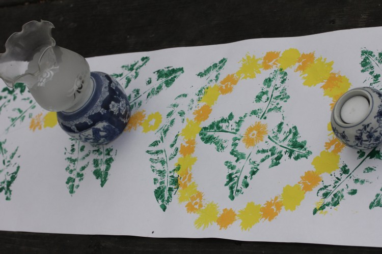 Dandelion table runner-made by using fresh plants as stamps with acrylic paint.