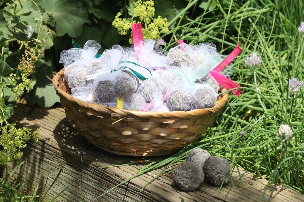 Seed balls are fun to make. It is important to find seeds native to your region. The small flowers found on most herbs are ideally suited for the anatomy of wild bees and other insects. Soil, dryer lint, clay, paper pulp and seeds are mixed in varying amounts before shaping into a ball that hold together. Once dried you can gift or “bomb” roadsides to encourage habitat restoration for pollinators.