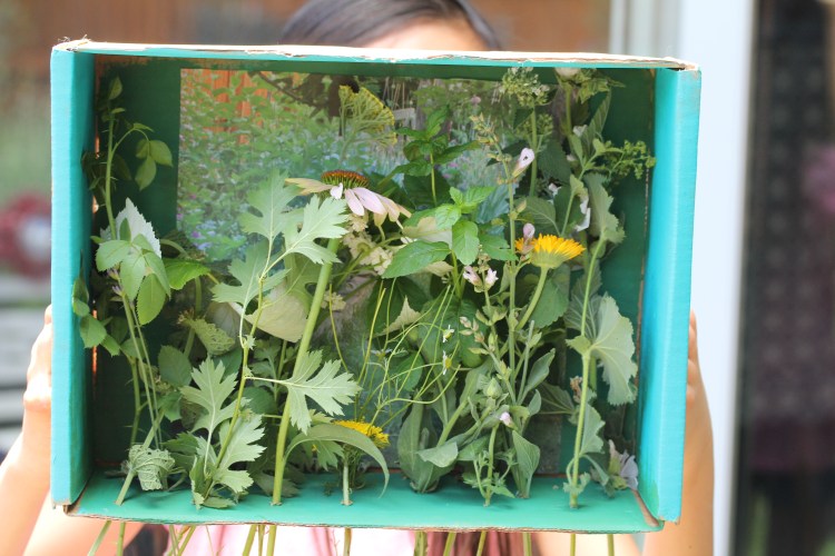 Planting an herb garden-Paint a shoebox with blue and green paint. Glue a xeroxed print of a photo from your garden in the bottom (back) of the box. Pick a selection of herbs with very long stems ( you can remove leaves). Poke several holes into one of the sides. Thread the stems through the holes. Arrange the height for a pleasing composition. Cut stems poking out to be the same length if you wish. The box can be hung as a a display on a wall and the plants allowed to dry.