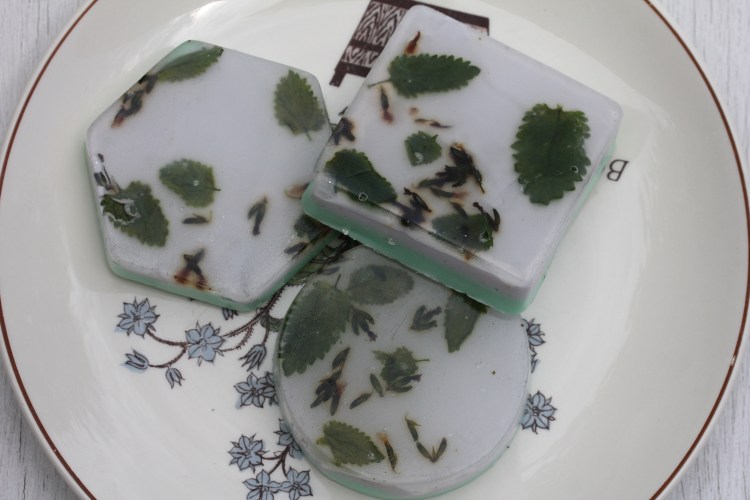 Herbal Soap-The photo just does not do these beautiful soaps justice. My daughter created this idea and made these herself. The soap preserves the fresh herbs and they stay vivid green for quite awhile. Spray your molds with rubbing alcohol, this prevents air bubbles. Melt and pour clear glycerine soap base it into your molds, let it set. Place your fresh herbs on top, with the backsides facing up towards you. Now do the white base ( shea or goat milk) that has been died a pastel color with food coloring, jade green works well. Let set and remove soap.