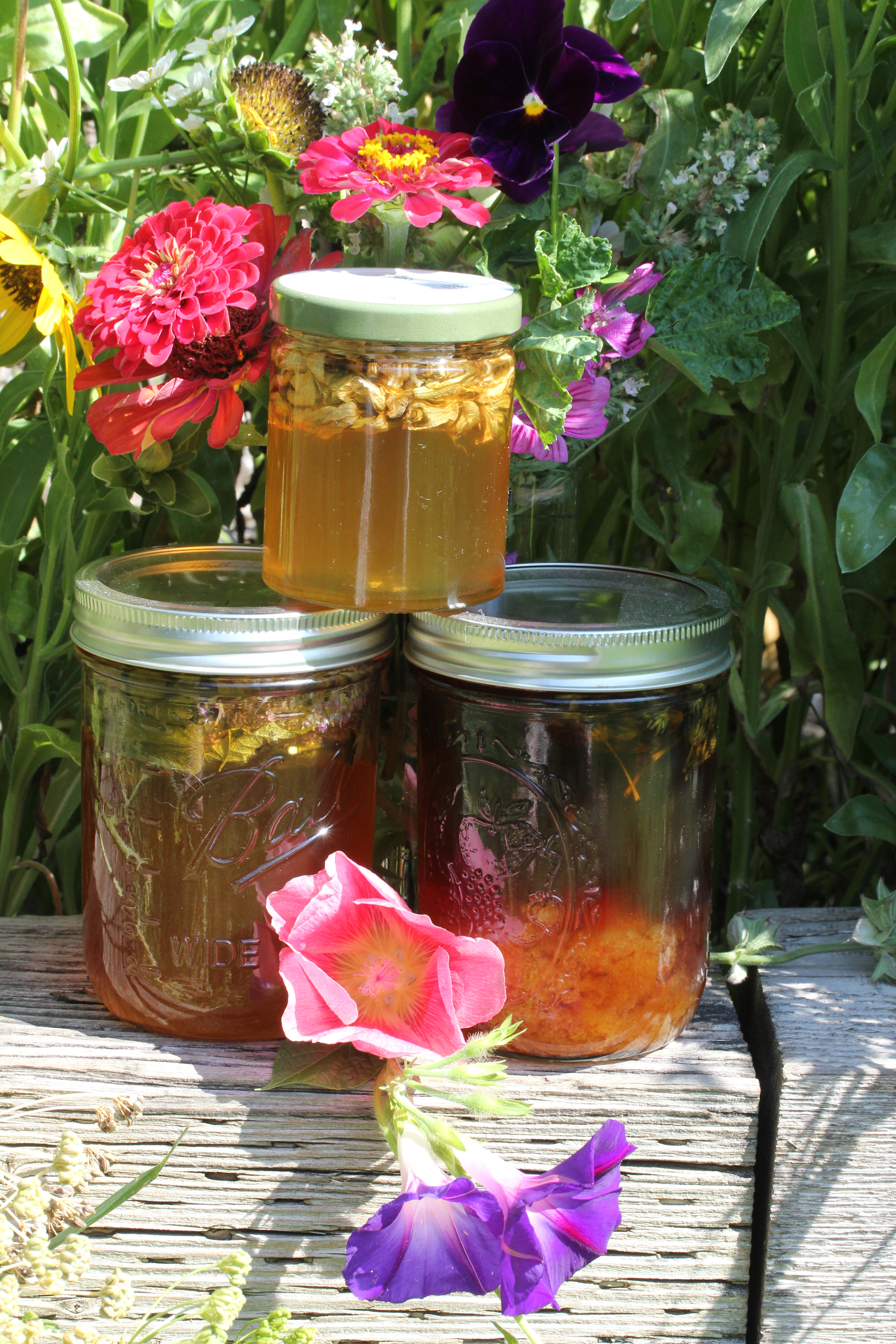 Herbal honeys are simple to make. Just fill 1/4 of a canning with fresh flowers (lavender, elder, lilac, clary sage, anise hyssop, lemon balm, calendula,rose) and let infuse for a month before straining.