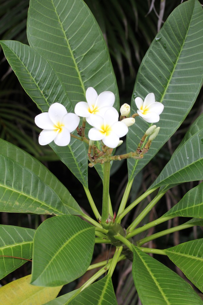 Plumeria in bloom is one of my favorite smells. Immediately I am transported to a place that is warm, wet, tropical, and green. Rainbows, the roar of the ocean, sandy feet, waterfalls, shaved ice, colorful fish, iridescent roosters, sea turtles, exotic orchids, tasty fruit, palm trees, snorkel masks, hikes in the rain forrest and the best coffee all come to mind when I inhale.