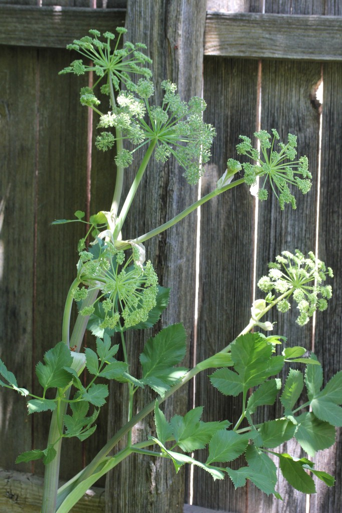 Angelica archangelica is a biennial/perennial plant in the parsley family. It very important to be sure of with identification for any plants in this family as it includes poison hemlock and hogweed, which are poisonous. Angelica grows well in most urban gardens. In the wild it prefers environments that are damp-swamps and marshes or well watered by rivers or streams. This plant grows 3-10 feet high. The stem is tall, thick, hollow, grooved, and tends to branch at the top. It is bright green with a blue/white matt like bloom. It’s few leaves grow from the stem as a sheath similar to celery. These can be quite large , triple divided and pinnate in shape. The pale green flowers grow as a large , spherical, compound umbel at the top of the plant . The “fruit” are green, oblong and similar to fennel but as they dry burst into yellow two winged seeds. The roots are red to brown. Like most members in its family, the whole plant has a very distinctive smell and taste. Angelica is sweet, spicey, and agreeable with a bitter aftertaste. All parts of this herb have been used as medicine.