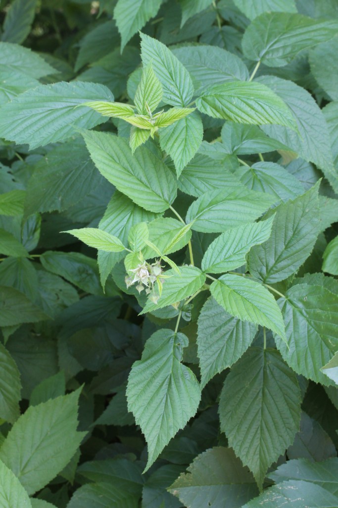 Raspberry is shrubby plant in the rose family that can grow as high as 6 feet tall. You can find it in wastelands, growing wild in the mountains, fields/meadows, as an unwanted thicket in urban areas and in gardens. The perennial root produces shooting stems/canes that live for 1-2 years. Some canes will have a blueish bloom on them and all are covered with fine “hairs” that may irritate the skin. Stems are covered in large alternate, pinnate leaves which are further divided into 3-7 leaflets which are serrated. These oblong/ovate leaflets have a pale/white downy underside. Clusters of white cupped shaped flowers with 5 petals appear in second year. The red edible fruit takes the form of a domed aggregate and is ripe in early or late summer. You will notice that a raspberry has left a bit of its insides on the plant when it has been picked. It appears hollow when you look inside. There are very distinct botanical differences between raspberries and black berries. Rubus prefers full sun but will tolerate some shade and poor/clay soil. It thrives best when well watered.