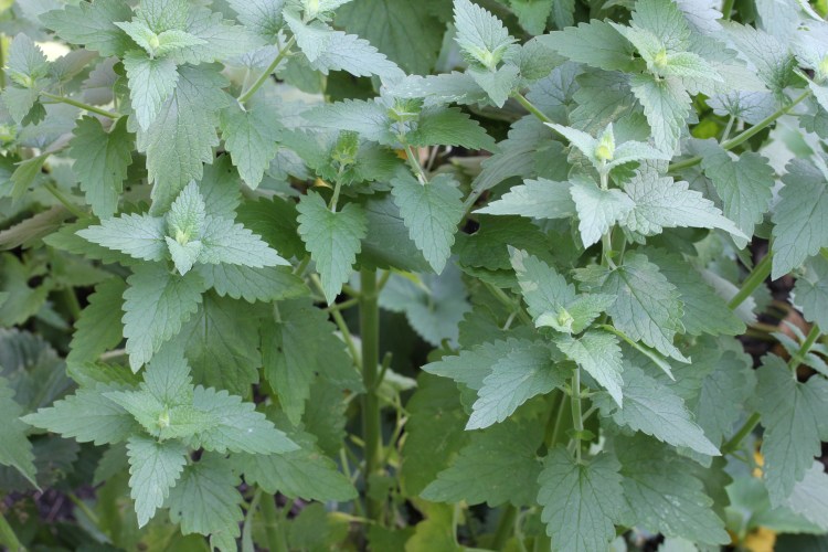 Catnip. Latin Name-Nepeta cataria. Family-Laminaceae/mint. Like all members of the mint family, Nepeta has small white/pink flowers clustered down a stalk. The heart/oval shaped leaves are arranged oppositely on a square stem and there is a very strong scent. It can be confused with other members like lemon balm or spearmint. Catnip has its own distinctive smell which obviously cats love. The leaves are a more “silver” green and they have a soft almost fuzzy texture, a toothed margin, and a paler underside. The stem is also hairy. It can grow 3-4 feet high, especially as it shoots up to flower. This herb is almost invasive in many places as it easily grows anywhere. You will find it in backyards, wastelands, in grazing areas, along a stream as you hike in town, or in cracks in the sidewalk. It is a self seeding perennial that likes a lot of sun and does well in poor soil. There is a similar plant called “catmint”. This plant has purple flowers and much smaller leaves. It is also in the Nepeta family and there are several varieties/species. You are more likely to find it as a cultivar than in the “wild”. All Nepetas have similar properties and uses.