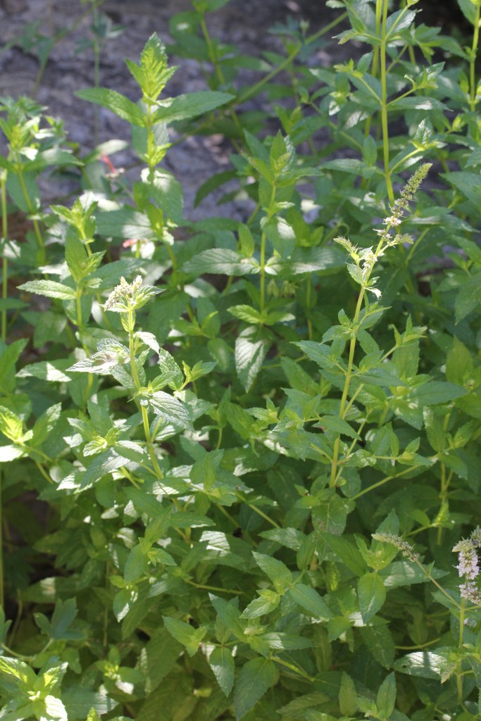 Mentha is in the mint/Lamiaceae family and includes both peppermint (Mentha piperita) and spearmint( Mentha spicata). Peppermint is a hybrid perennial plant that is most often found cultivated in gardens. This herb is highly aromatic( menthol). It has erect, square, branching, purple stems. It’s opposite leaves are opposite, oval/lance shaped and often serrated. The sepals and petals are united to form tiny purple flower that have 5 two lipped lobes (2 up, 3 down). These are arranged at the ends of axillary and terminal spikes. Spearmint lacks the purple hues in it’s foliage and is a more vibrant green. The leaves are often greater in number, larger and more serrated and “wrinkled”. They are sessile and have a very short petiole where they join the stem. This plant is usually taller than peppermint. The flowers are more numerous/dense on a larger , interrupted spike. Mints can be invasive and spread quickly through their rhizomes. They will tolerate any kind of soil and thrive in both sun and shade. Grow mints near your vegetables to keep them free of insects and other pests. These plants are a favorite of native bees.
