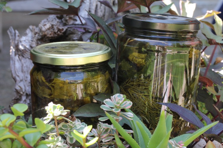 1)Make 1/2 cup of oil infusion choosing some combination from the suggested list above. You can use fresh or dried plants. Let infuse for no more than 4 weeks before strainin