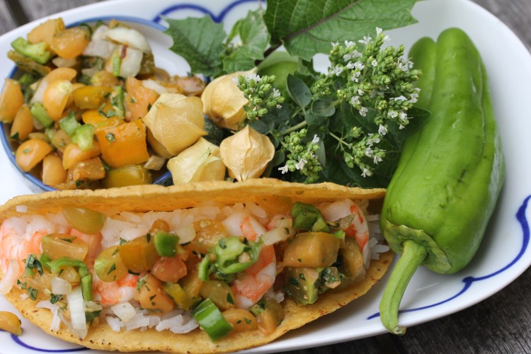 This is my first year for growing ground cherries in the the garden. I was surprised at the size of the plants and that I had a bumper crop. I have tried to grow starts indoors from seed in years past, but never had good luck. I purchased 2 plants from a local nursery and had more than enough fruit for my needs. I think our investment in excellent soil and a location in the sun all day really helped too. Ground cherries are in the nightshade family. Imagine a large tomato plant that trails all over the ground instead of being held vertical in a cage. It was my first year for eating a ground cherry too. They are like a round golden grape in a paper husk. The taste is a bit like a tomato but more tart than acidic, a bit sweeter, with hints of some kind of tropical fruit. Ground cherries can be substituted in recipes that call for tomatoes or firm fruit. The following recipe is best when made from very fresh ingredients and consumed within 24 hours of making. Honestly this pico de gallo is so good that I pretty much ate it all by myself in one sitting just paired with chips. It goes well with shrimp or other fish in something like a simple taco.