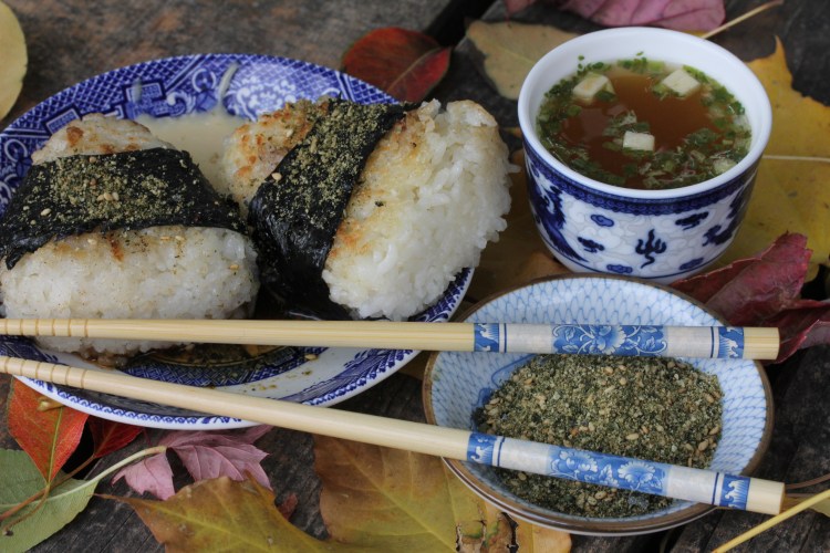 What is furikake– a Japanese condiment made with tiny bits of dried ingredients like wasabi, nori ,egg, bonito/fish flakes, sesame seeds, and shiso leaves. . It is typically served on bland things like rice, noodles, vegetables, or fish. I like it served on popcorn or onigiri (a Japanese style rice “sandwich”) It is not the same as gomasio which is ground unhulled sesame seeds and sea salt. Urban legend says that furikake was invented to address calcium and protein deficiencies in the early 1900’s and during WW II.