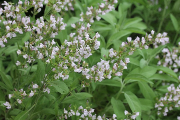 Sage is a shrubby perennial that is native to Europe. It grows well and overwinters even in my climate. In any garden that I have had it establishes itself as a “mother plant”. The stems are square, woody, long, finely haired and often leggy. With time and age my plants become less attractive but more productive in leaves. This herb can be sensitive. If you offend it, neglect it, damage it when harvesting-you may not see it the following year. The downy, oval shaped, crenated, opposite arranged leaves have a “sage” green color. The flowers are purple (sometimes white) tube shaped, two lipped, and grow widely spaced on terminal racemes. High in aromatic essential oils and botanical features clearly place it in the mint family.