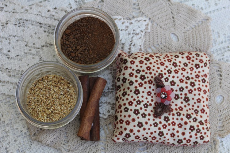 Cloth trivet stuffed with play sand and ground spices. Releases a lovely smell/aromatherapy when a hot beverage is placed on top.