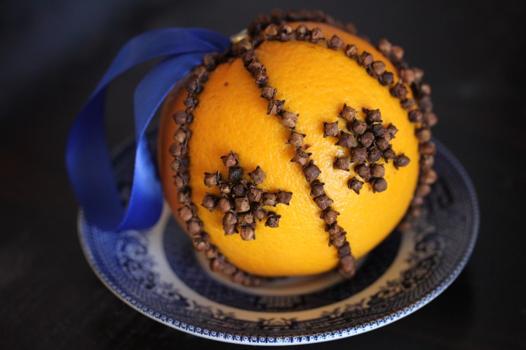Pomander Ball-draw a design onto an orange with a ballpoint pen. Using. a toothpick poke regular holes along the line of your design. Insert whole cloves. (optional) cut a length of ribbon and make a loop, tie a knot. Use a brad or thumbtack to attach it to your orange
