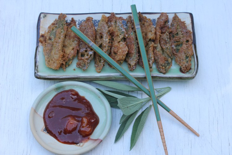 Usually by late October there has been a snowstorm to wipe out all of the herbs in my garden. As our climate changes, even in early fall, I now not only have tender flowers surviving but I am still harvesting an overabundance of things like sage, fennel, horehound, oregano and calendula. Sage has a powerful flavor that works well in some savory dishes. A few desserts like that pear sweat bread that I made last year. In other words it is easy to run out of things to do with it. This a a great recipe for using up this herb late in the herbal year. You will need to have some very large fat leaves to start with.