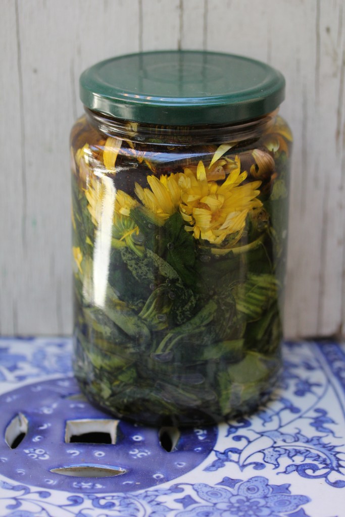 I always use a folk method for making oils. I let the plants guide me as to what is to picked and how much. For this oil I loosely packed a large jar with calendula flowers, echinacea flowers, plantain leaf, and comfrey Leaf. I prefer to use organic US grown olive oil. So far this has created oils that are stable, have a long storage life and don’t require added preservatives. Since there is a lot of fresh plant material in this product, I will only do the infusion for 2 weeks. It is warm enough in my house during the summer months that I can just let it sit on top of a cabinet. I make sure to release any air bubbles before sealing and try not to rupture cells wall by too much by applying a lot of pressure when straining.