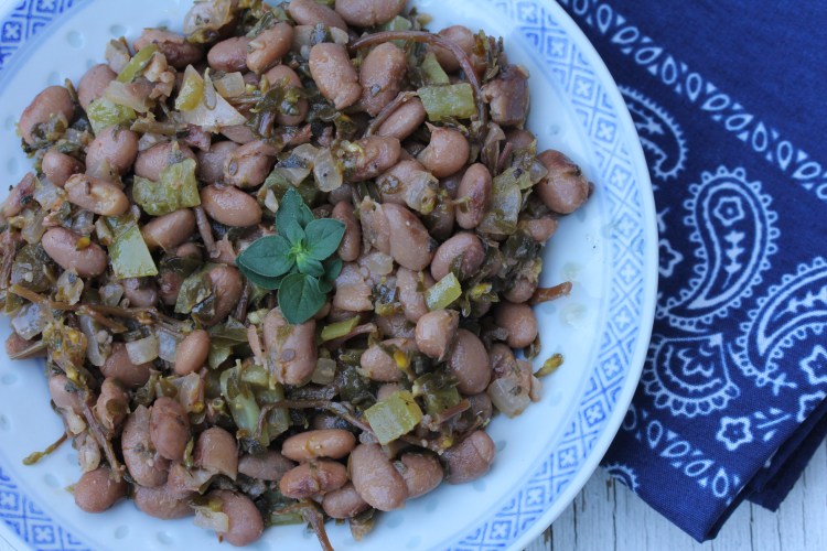 I have a bumper crop of oregano this year. Homegrown fresh or dried oregano tastes so much better than anything you could ever buy in a store. Purslane also grows in my garden in great abundance. Highly invasive but also high in nutrients like Omega Fatty Acids and vitamins A, C, and E. Thankfully it is pretty easy to remove. This recipe is inspired by Georgia O’Keefe’s cookbook, written when she lived in the Southwest. Oregano is a common ingredient in many global cuisines. The Greeks and Spanish have paired this herb with purslane for centuries. In the US purslane is an “emergency” food for some but in a harsh environment foraged regularly by Indigenous people. It is unknown how it reached the Americas before colonization. Purslane is both salty and sour, a bit slimy like okra. This salad is great cold or heated and served with eggs for breakfast. My recipe is vegan but traditional ones probably contained pork. I replaced that protein with pinto beans.