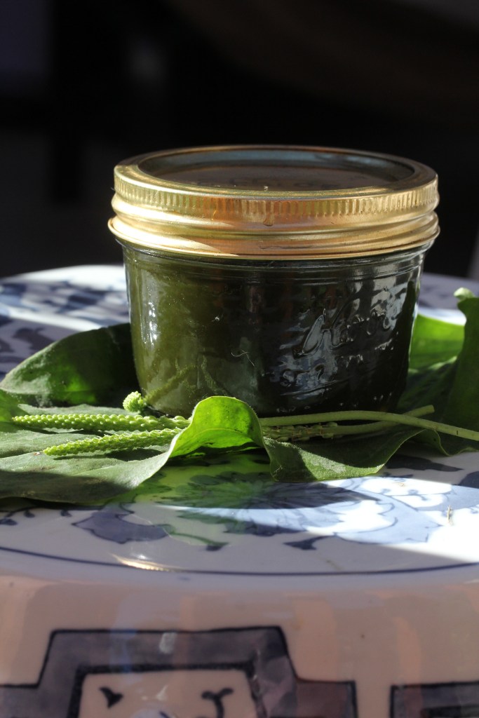 Directions: Juice/blend a generous handful of fresh plantain leaves. Run the mixture through a fine sieve to remove the pulp. Measure and mix with equal parts honey. Freeze in a container or ice cube trays. Defrost and use when needed for coughs and stomach ulcers.