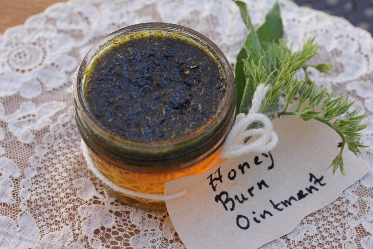 I have infused flowers such as elder, rose, hyssop and clary sage in honey. Honey can be combined with fresh fruit and herbs in an oxymel. Juiced herbs blend with honey in a succus. I whip finely powdered elder berries, lavender flowers, calendula, or rose hips into honey to support the immune system in winter. I coarsely grind herbs such as licorice and marshmallow root or fennel seed to make electuaries. Since one is using dried materials, experimenting with honey as a medicine allows the herbal year to extend into fall and winter. The following recipes combines honey with ground herbs to make an ointment to treat burns. My burn salve is one of the most popular things that I make a give to friends. I hope this product yields equally effective results.