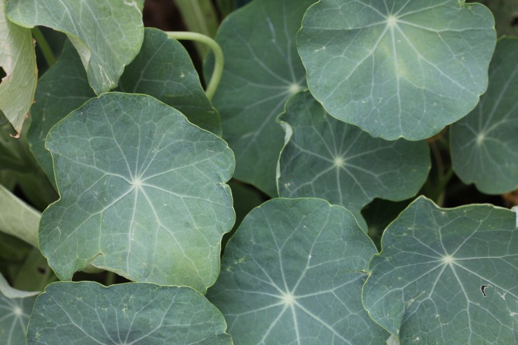 Nasturtium is an annual plant that is cultivated all over the world. Comes in both bush and trailing varieties. Thin, succulent , branching ,stems can grow at long as 10 feet. Leaves can be various sizes depending on the cultivar. These are alternate, round, radially veinated/palmately lobed with slightly scalloped or ruffled edges. Flowers come in shades of red, orange and yellow. These are set on the ends of long stalks in the axis of leaves. Each is funnel shaped with a frilly/clawed interior. There are five sepals/petals, with the topmost ending in a nectar spur. The “naked” fruit is a 1 -2cm, round, green ball that has 3 segments. Each of these contains a seed.