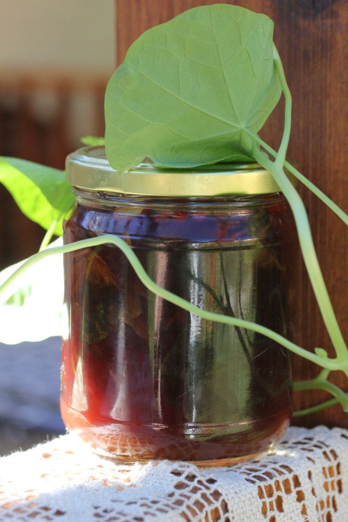 This was another early fall project. Nasturtium is very frost sensitive. I have come across all kinds of recipes that use this plant. I love the flowers in my peach salad. The leaves can be used to make “cabbage rolls” and pesto. This vinegar might appear to be culinary but it is actually meant to be more medicinal, even if you add it to some quality olive oil to make a dressing. I love the ruby red color. I added some pink peppercorns to bring out the “spicy” taste of the leaves even more. Some medicine is allowed to taste good.