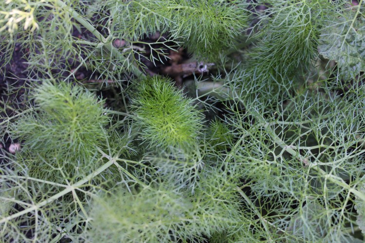 Dill is typically an annual plant, sometimes biennial. It has a hollow, finely grooved stem that grows 1-3 feet high. This appears striped green with dull light blue areas. Leaves are bluish green, bipinnate, with filiform leaflets. Each leaf dilates at its base to wrap around and join the the stem as a sheath. The flowers are flat compound umbels of tiny yellow flowers that mature into narrow, oval, ribbed seeds.