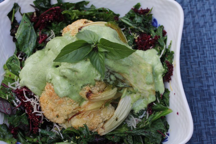 1/2 a large cauliflower roasted in its entirety in a large baking pan. Basted with 1-2 TBP of olive oil, salt and pepper to taste. Oven temperature at 400 until it can be pierced with a fork, about 30 minutes.