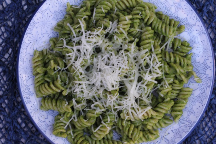 Mix into cooked warm pasta and top with the parmesan cheese of your choice. Any leftover pesto will store in the refrigerator for at least two weeks.