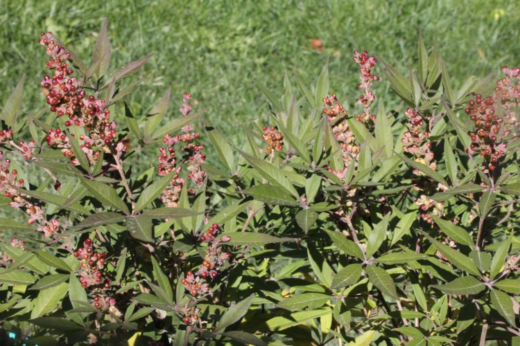 This perennial, ornamental, shrub/bush can grow up to 9 feet high. Aromatic leaves are opposite, palmate with 5 spade shaped, fully separated lobes/leaflets on long stems. These have smooth margins, prominent veins, and are a bluish green. Tiny purple/blue flowers (irregular, tube shaped) grow as long clusters/racemes/spikes at the end of stems. Numerous, “spicy” red berries mature into blue-gray seeds that are similar to peppercorns.